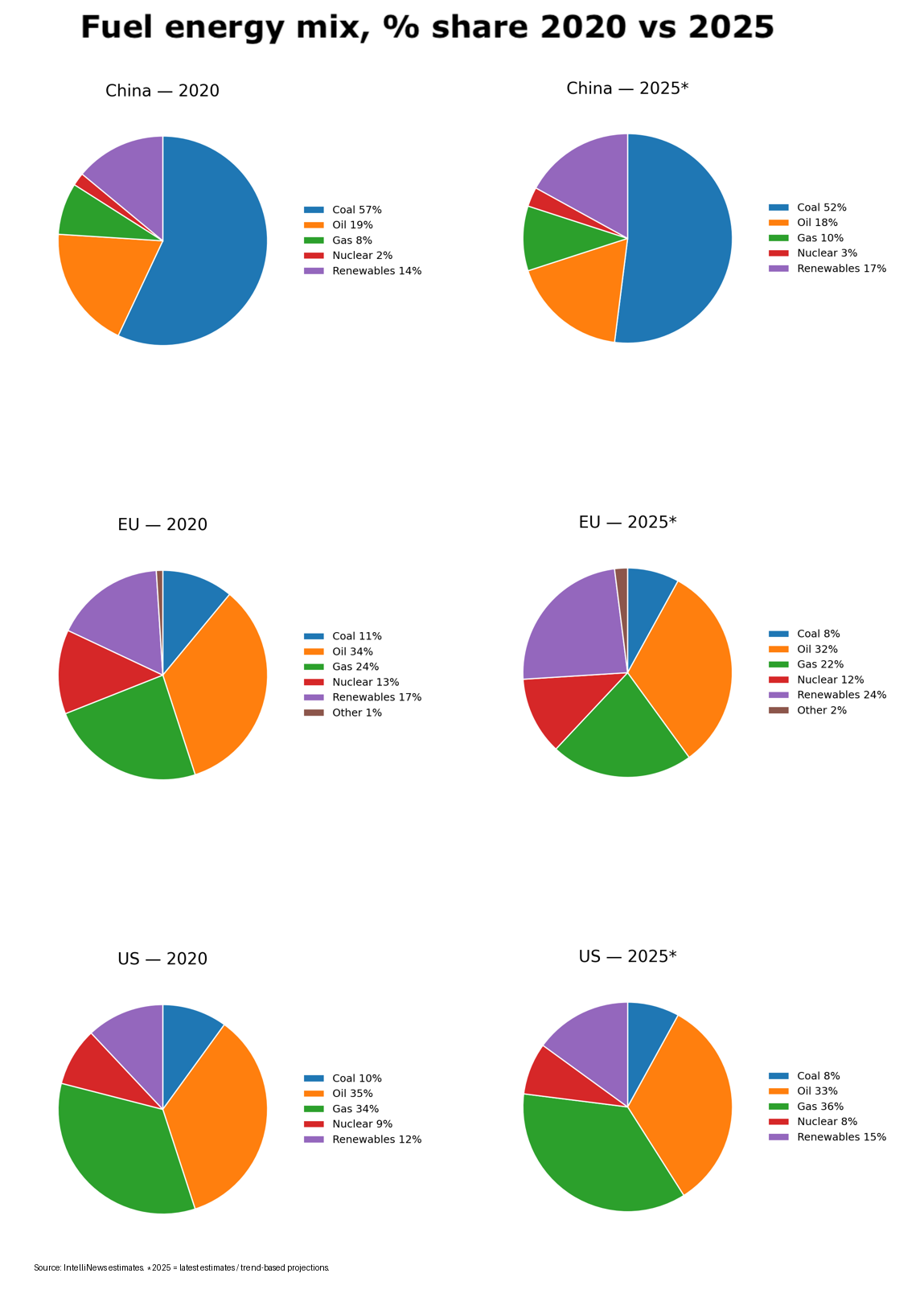 Asia is much more dependent on coal and gas, but there too the green transition is accelerating. China has rapidly diversified its energy mix and built up huge reserves of oil and gas. But it is also well protected from the energy shocks thanks to a substantial coal-fired power station reserves, but also the rapid expansion of green power generation which overtook coal-fired production two years ago. By contrast, the Trump administration is trying to expand its “beautiful clean coal” generating capacity, according to US President Donald Trump. China also has an extensive fleet of nuclear power plants (NPP) and is currently building 26 new nuclear power plants, while the US is building none and Germany not only shuttered its six large and extremely efficient NPPs, the previous government blew them up to ensure no government in the future could restart them.