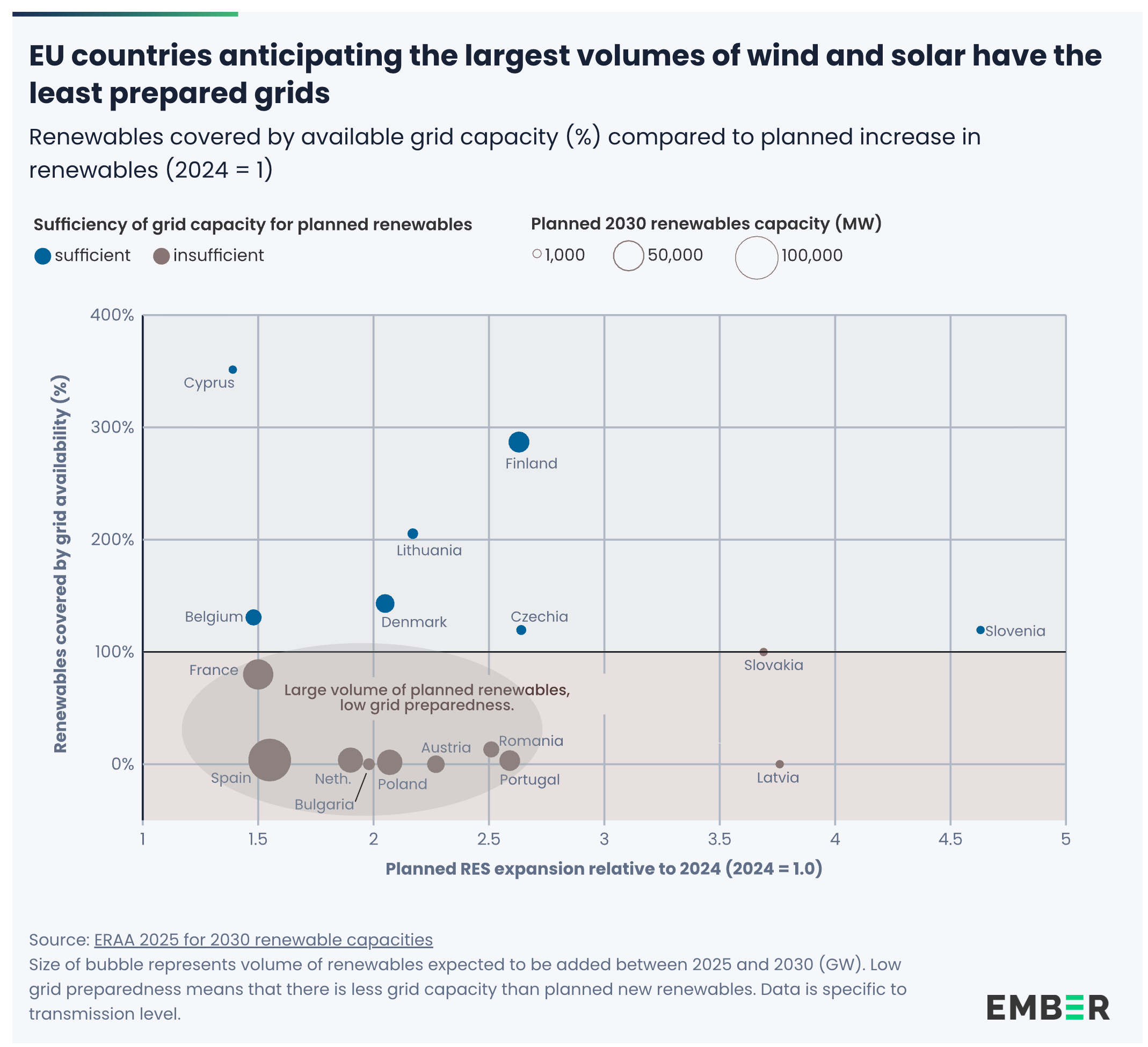 That is starting to turn into a bottleneck. Ember reports that across 20 EU countries, grid infrastructure is not keeping pace with the bloc’s energy transition or industrial electrification needs. Around half of reporting countries lack the capacity required to connect new renewable generation, with the most severe constraints concentrated in Austria, Bulgaria, Latvia, the Netherlands, Poland, Portugal, Romania and Slovakia.
