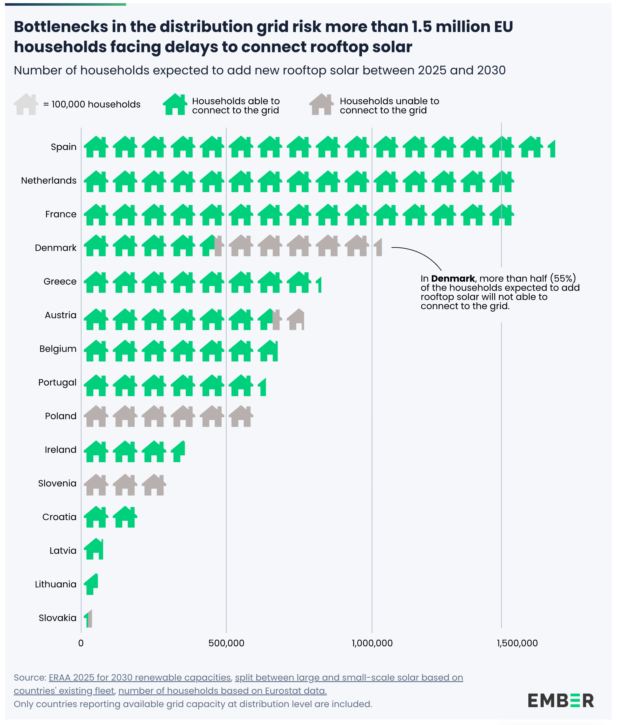 At least 16 GW of planned rooftop solar by 2030 is at risk, affecting up to 1.5mn households. Slovenia and Denmark are the most exposed, with grid limitations potentially impacting 32% and 19% of households respectively.