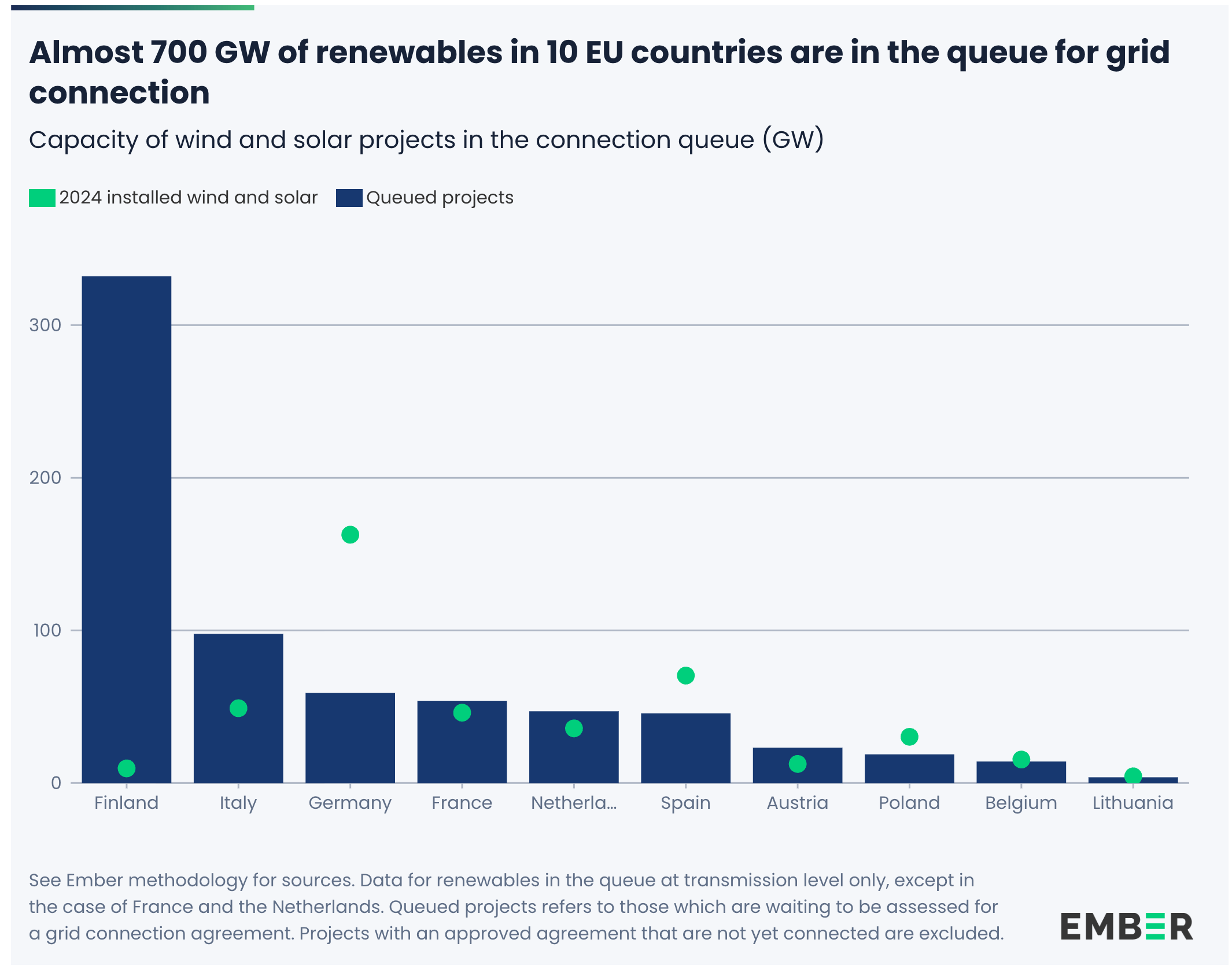 Grid congestion is compounded by a growing backlog of projects awaiting connection. Nearly 700 GW of renewable capacity is currently in connection queues across eight reporting countries.