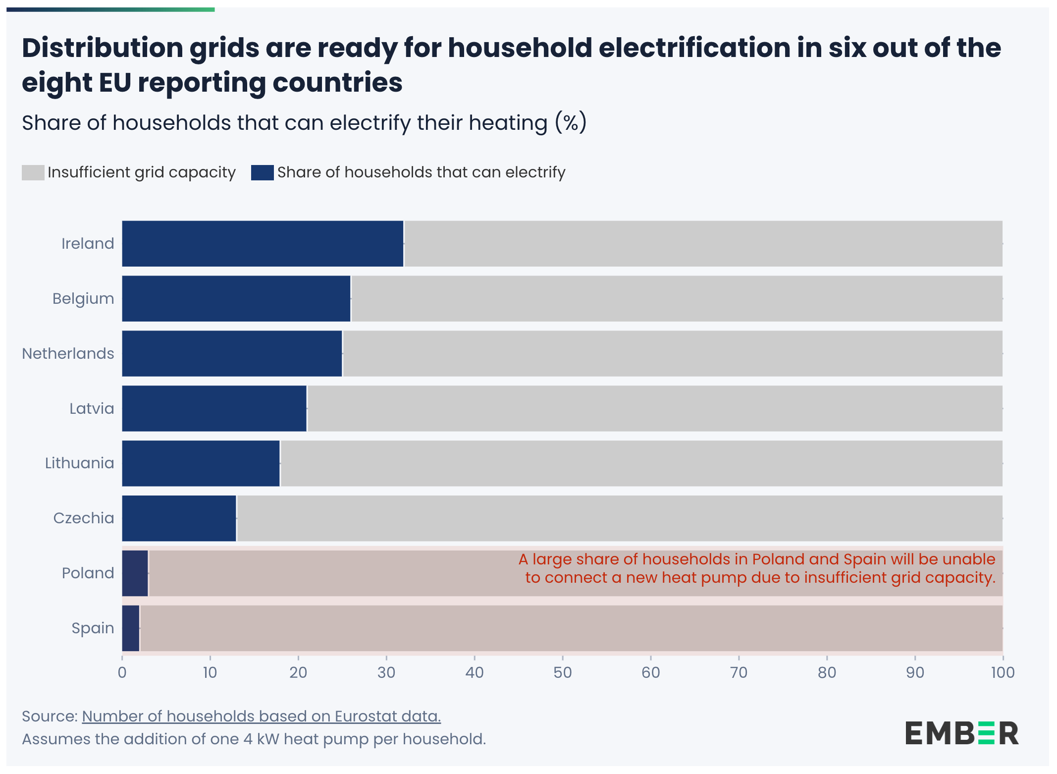 Ireland leads, with capacity for heat pumps in 32% of households and EV chargers in 18%. Belgium and Latvia follow, with capacity for 26% and 21% of households respectively.