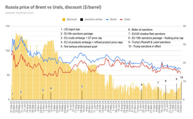 By the autumn, Western politicians decided that something must be done and on October 2 launched the “first serious enforcement push” (5) against price-cap evasion and the shadow fleet. On that date, the Brent–Urals spread was $15.20, slightly tighter than in September but half what it was at the start of the war. Enforcement did not immediately blow the discount back out, but it appears to have prevented further compression: through October and November the gap remained in the $14–19 band, rising to around $19 again by late November.