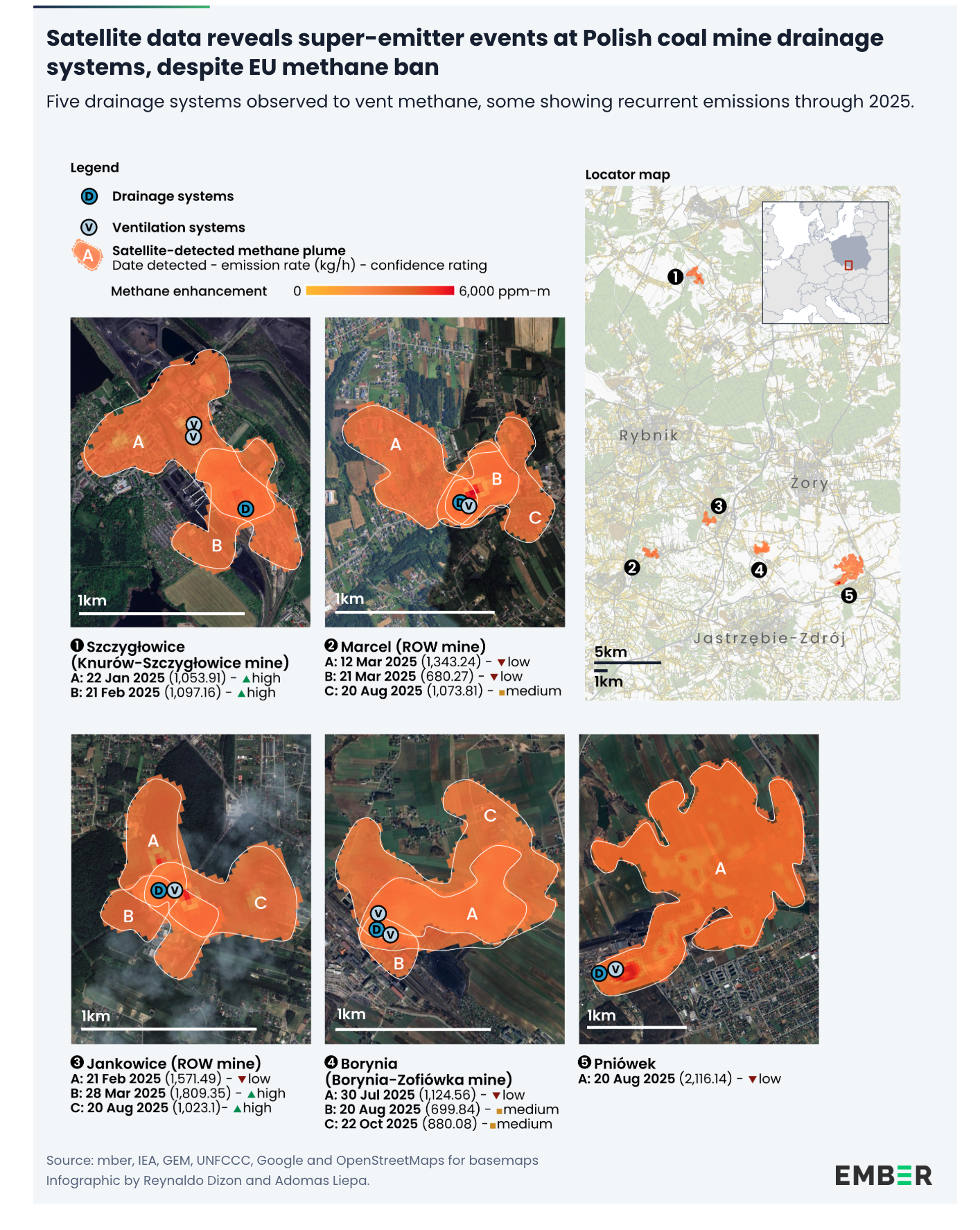 In 2025, 96% of methane plumes (109 out of 114 plumes analysed) over onshore European energy infrastructure were traced to Polish coal mines, making Poland the most frequent fossil fuel methane super-emitter in the EU. 5 out of 22 drainage systems in Polish coal mines were observed venting methane in 2025, despite the EU ban. "This is especially alarming given that no systems for verification or penalties are in place," says Ember.