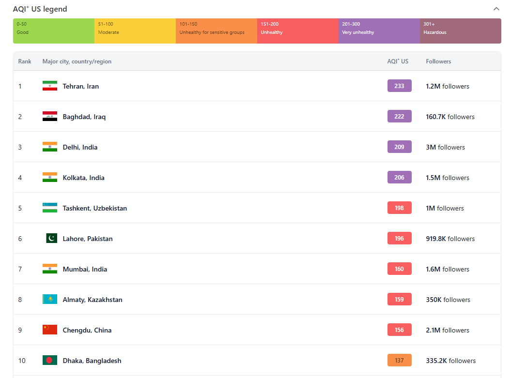 IQAir's real-time rankings place Tehran ahead of Baghdad (AQI 222), Delhi (209), and Kolkata (206) in the "very unhealthy" category, indicating severe health risks for all residents. The primary pollutant affecting most stations was particulate matter smaller than 2.5 microns (PM2.5).