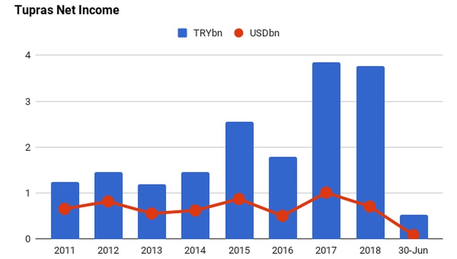 In H1, Tupras’ net profit declined to TRY495mn from TRY1.41bn a year ago due to a net loss recorded in the first quarter while revenues rose to TRY45bn from TRY34bn.