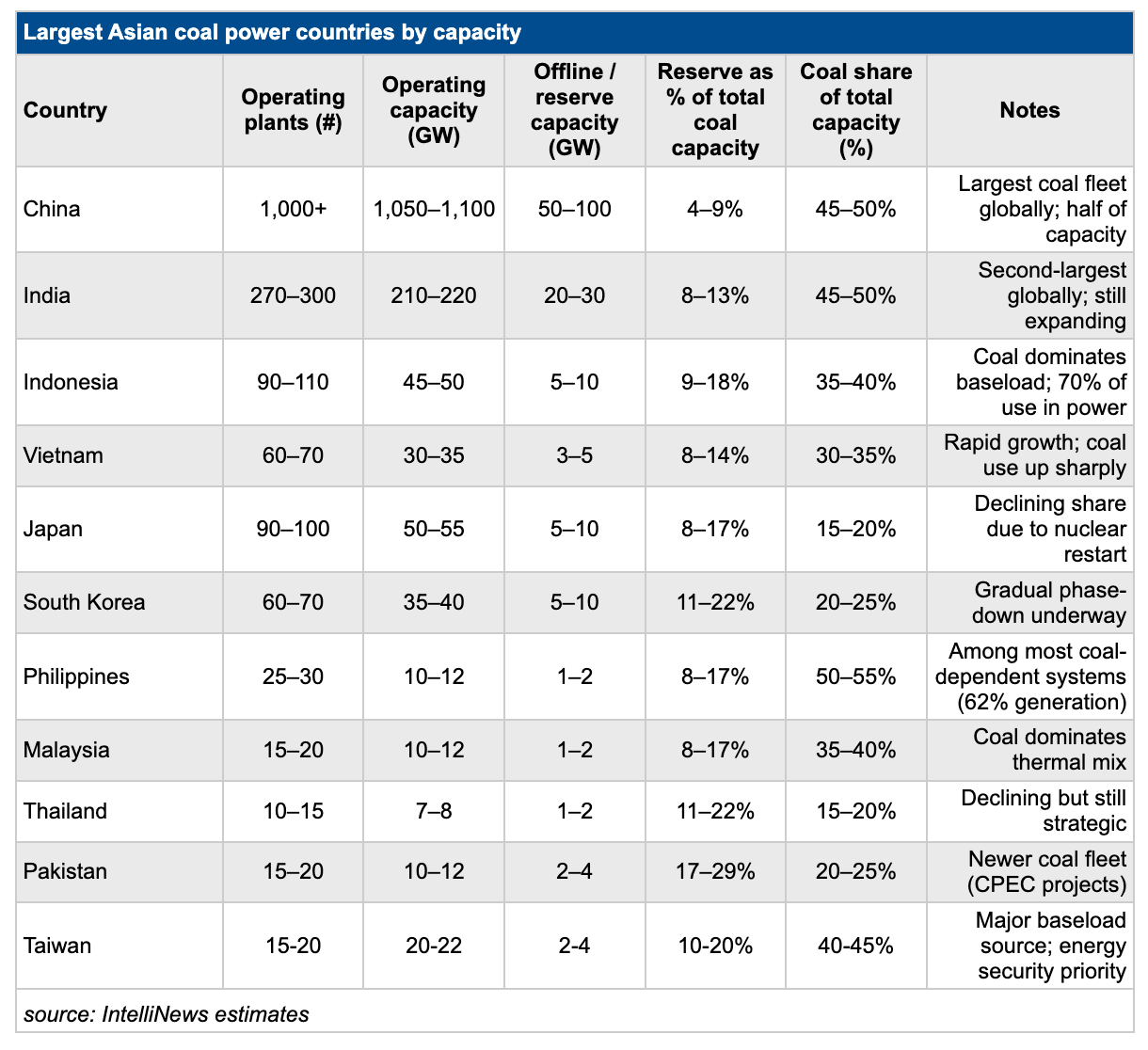 The situation is similar in the rest of SE Asia where coal plays a more important role than in Europe and offline capacity is around 10% of the total. In countries with a higher share, such as Thailand with some 20% of its coal-fired power capacity offline, the larger shares are usually due to the fact these countries were still in the process of switching to gas and not renewables.